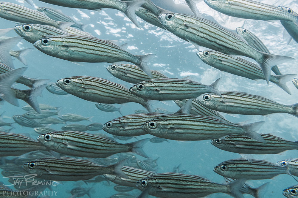 A school of striped salema swim below the surface at Bahia Conway on Santa Cruz island.